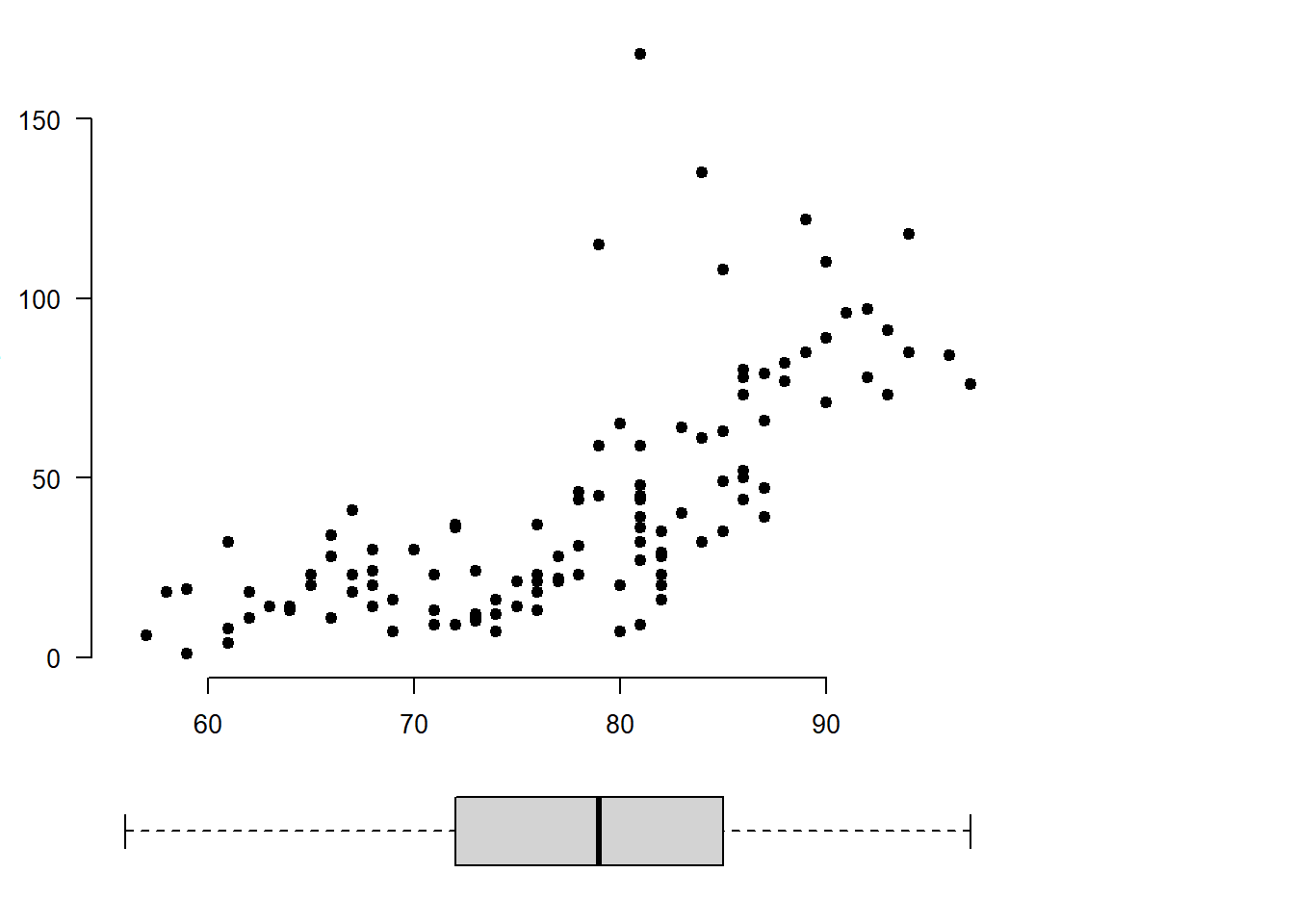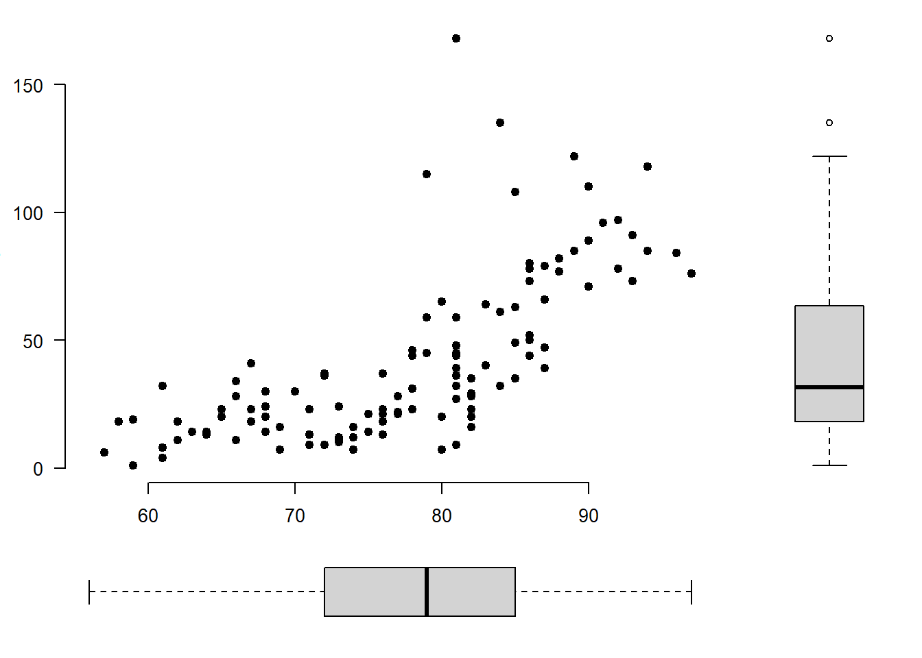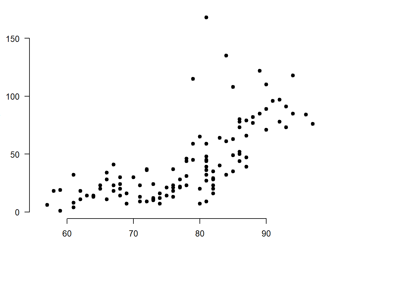 y <- airquality$OzonePirmiausia nubraižome pagrindinę sklaidos diagramą. Nustatome paraščių pločius.