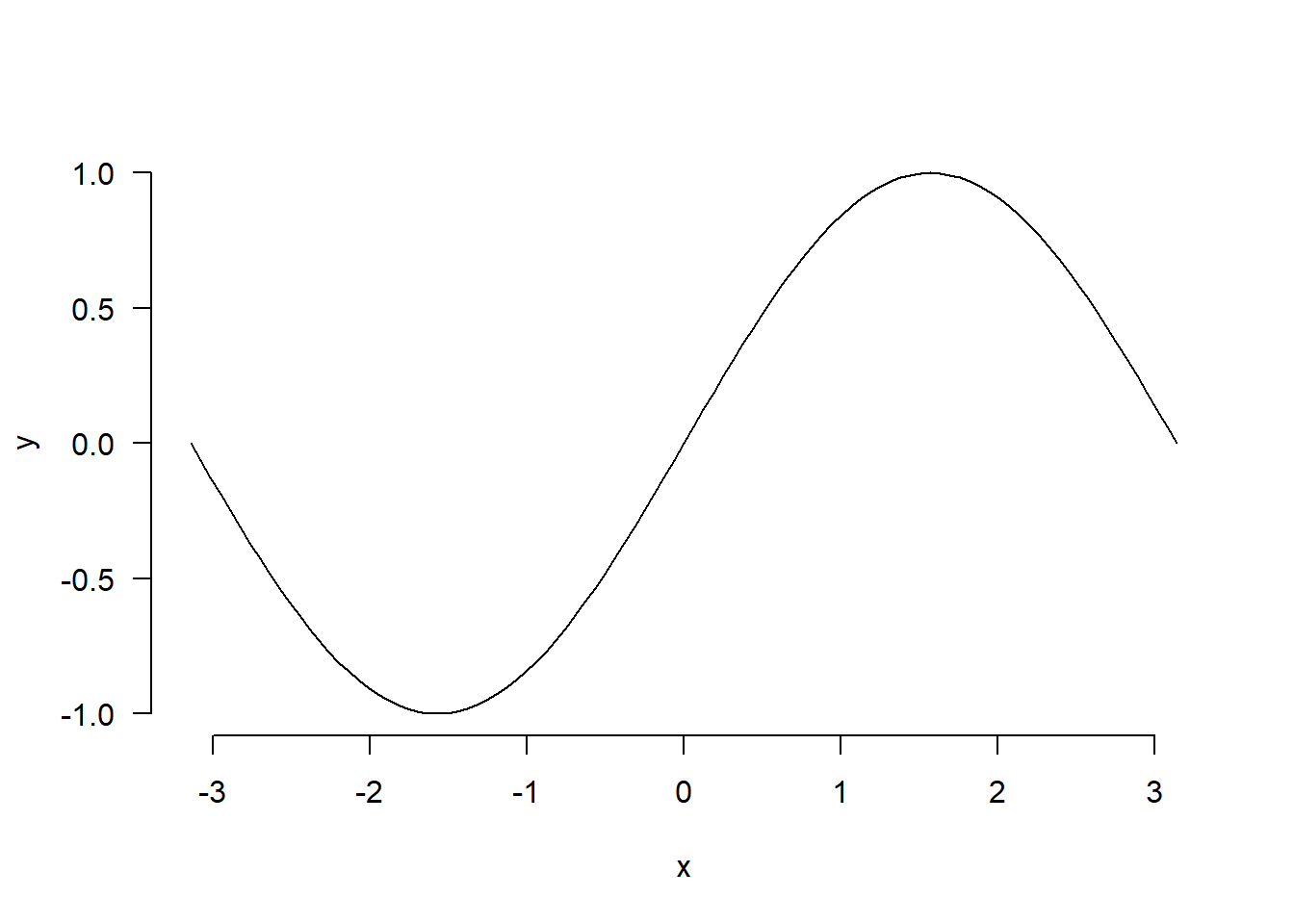 curve(sin, -pi, pi, xlab = "x", ylab = "y", las = 1, frame = FALSE)