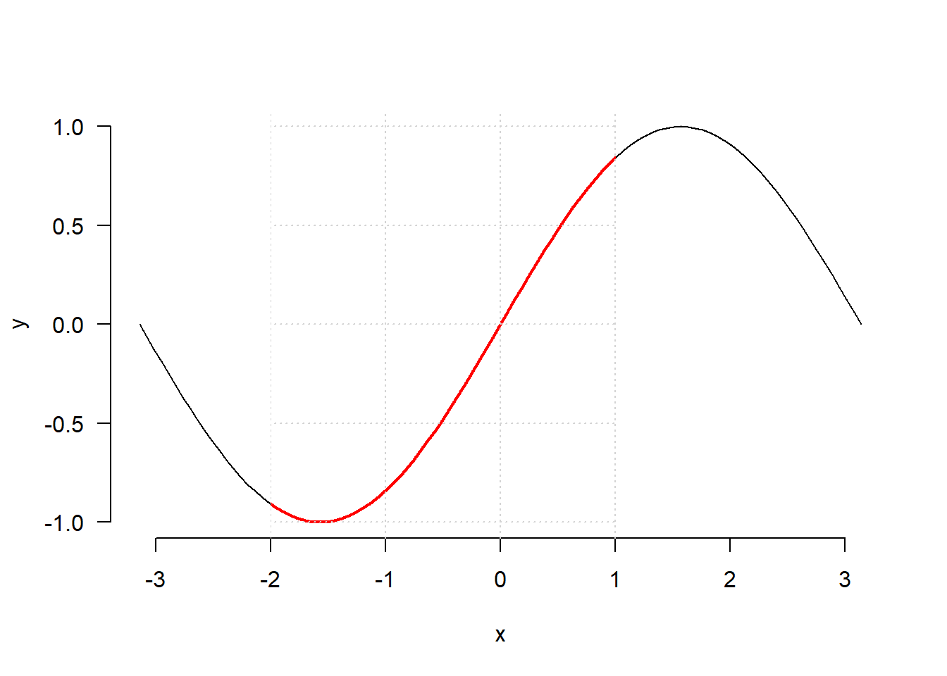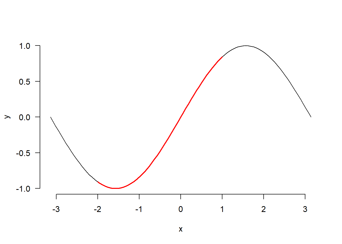 curve(sin, -pi, pi, add = TRUE, col = "red", lwd = 2)