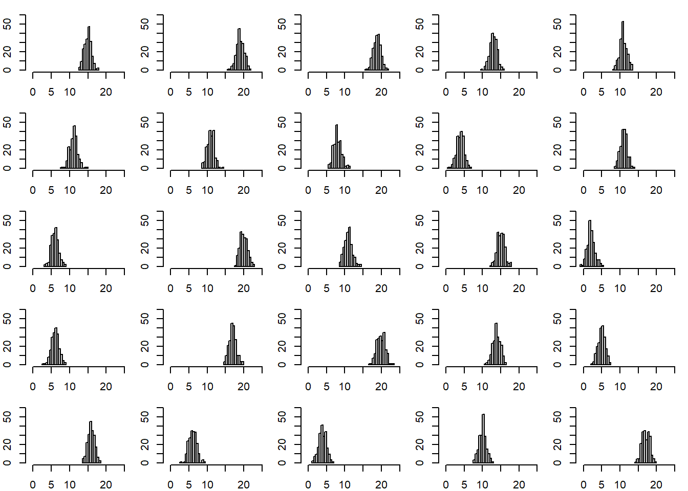 Dažnai tenka nagrinėti ir tarpusavyje palyginti daug tokio paties tipo grafikų. Tam, kad visi grafikai būtų matomi vienu metu, juos galima nubraižyti į keletą dalių sudalintame grafiniame lange. Tarkime, kad eksperimentas kartojamas 25 kartus. Reikia nubraižyti kiekvieno bandymo matavimų histogramas. Čia duomenys duoti matricos pavidalu.