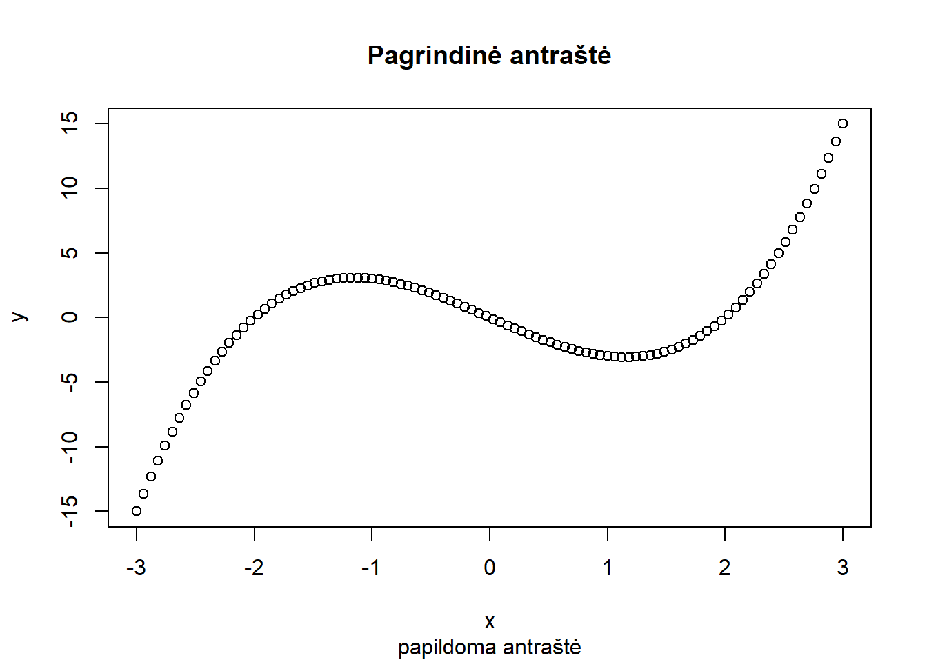 plot(x, y, main = "Pagrindinė antraštė", sub = "papildoma antraštė")