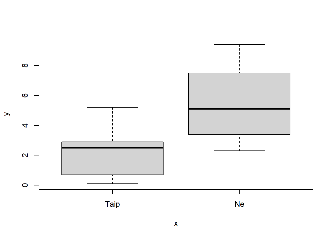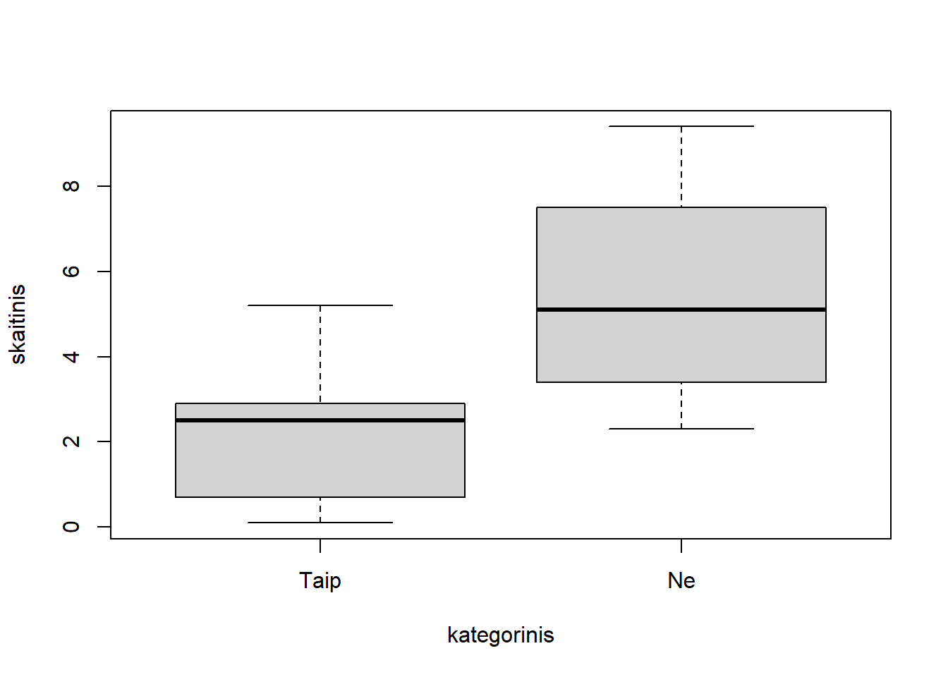 Jeigu parametrui x priskiriamas kategorinis (faktorius) vektorius, o parametrui y – skaitinis, tai iš skirtingoms grupėms priklausančių skaitinio kintamajo reikšmių sudaromos atskiros tų kategorijų boxplot diagramos.
