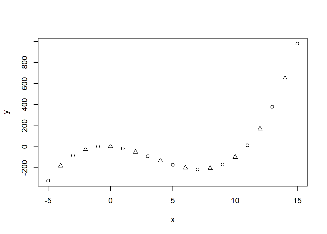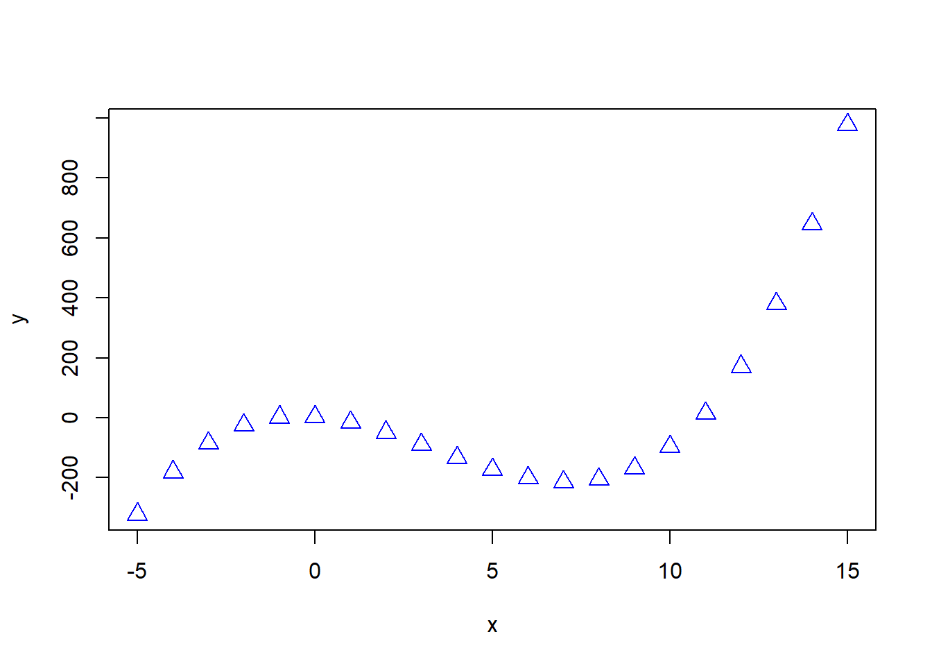 plot(x, y, pch = 2, col = "blue", cex = 1.5)