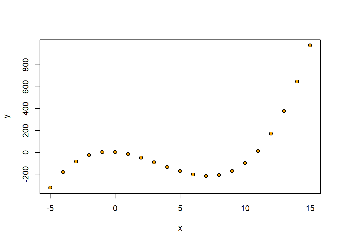 plot(x, y, pch = 21, col = "black", bg = "orange")