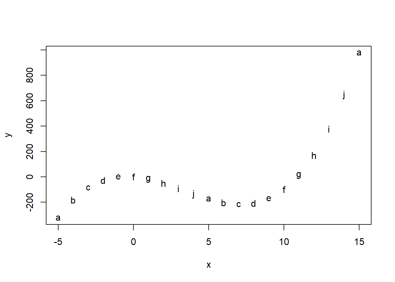 Formulėje įrašyti kintamieji nebūtinai turi būti duomenų lentelėje. Pavyzdžiui, nubraižysime sąrašo l kintamųjų x ir y sklaidos diagramą.